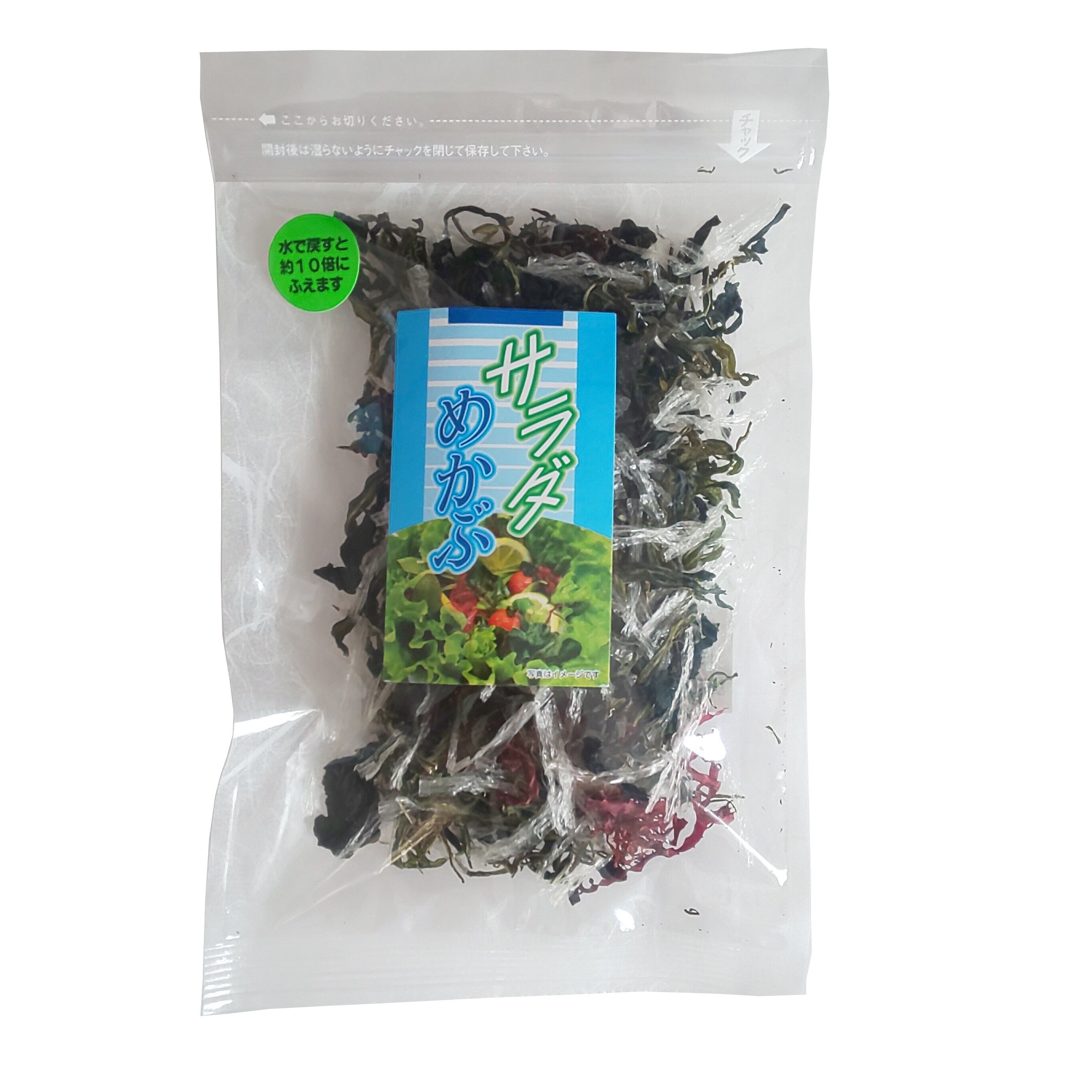 ◆茎わかめのシャキシャキした食感が心地良い、寒天たっぷり、めかぶ入りの海藻サラダミックスです。